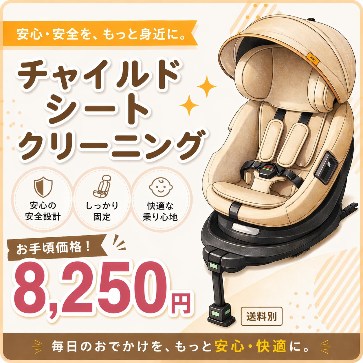 全ての作業は、赤ちゃんに優しい洗浄剤を使用して行いますので、安心してお任せください。チャイルドシートをクリーンに保ち、快適な移動時間をサポートしましょう!