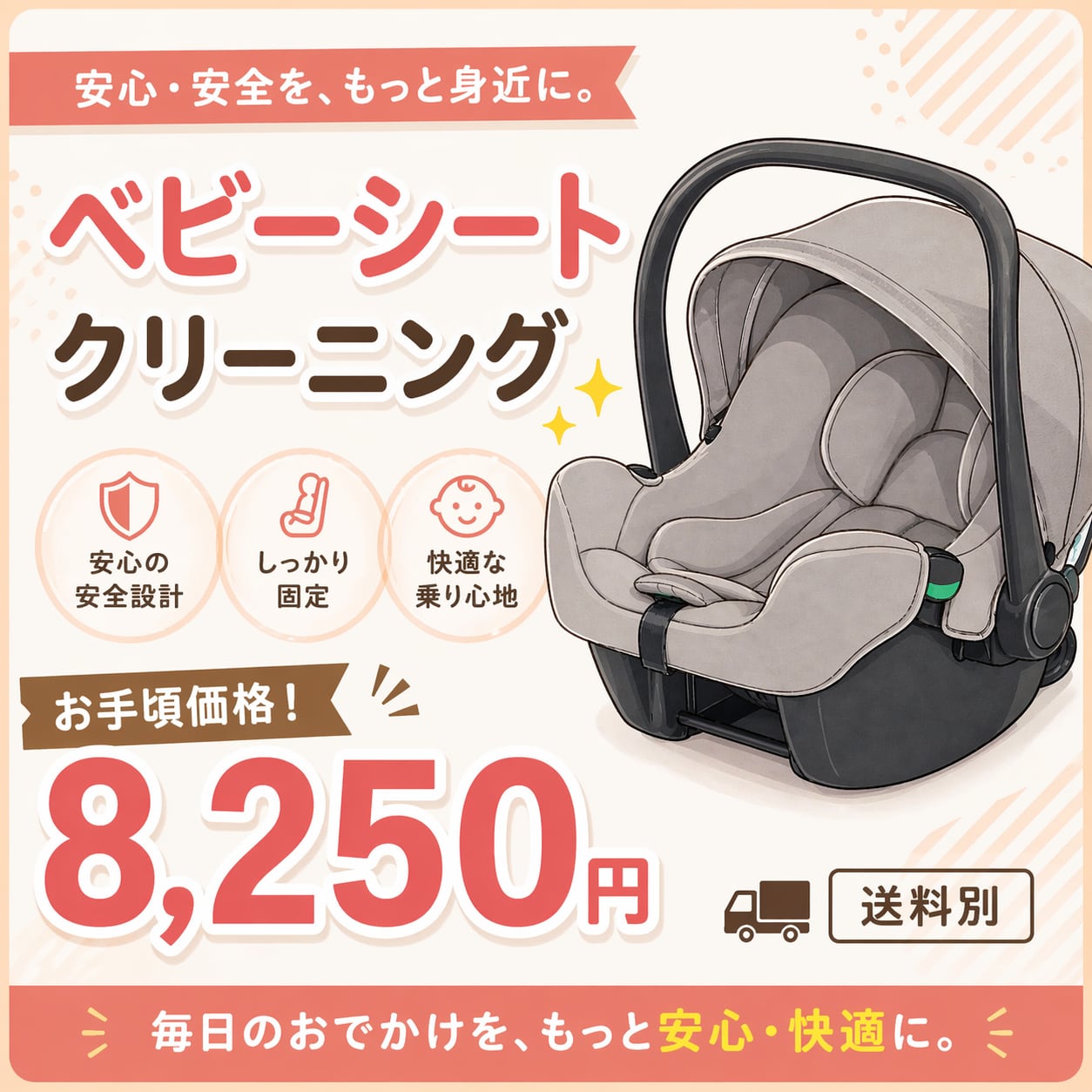 全ての作業は、赤ちゃんに優しい洗浄剤を使用して行いますので、安心してお任せください。チャイルドシートをクリーンに保ち、快適な移動時間をサポートしましょう!