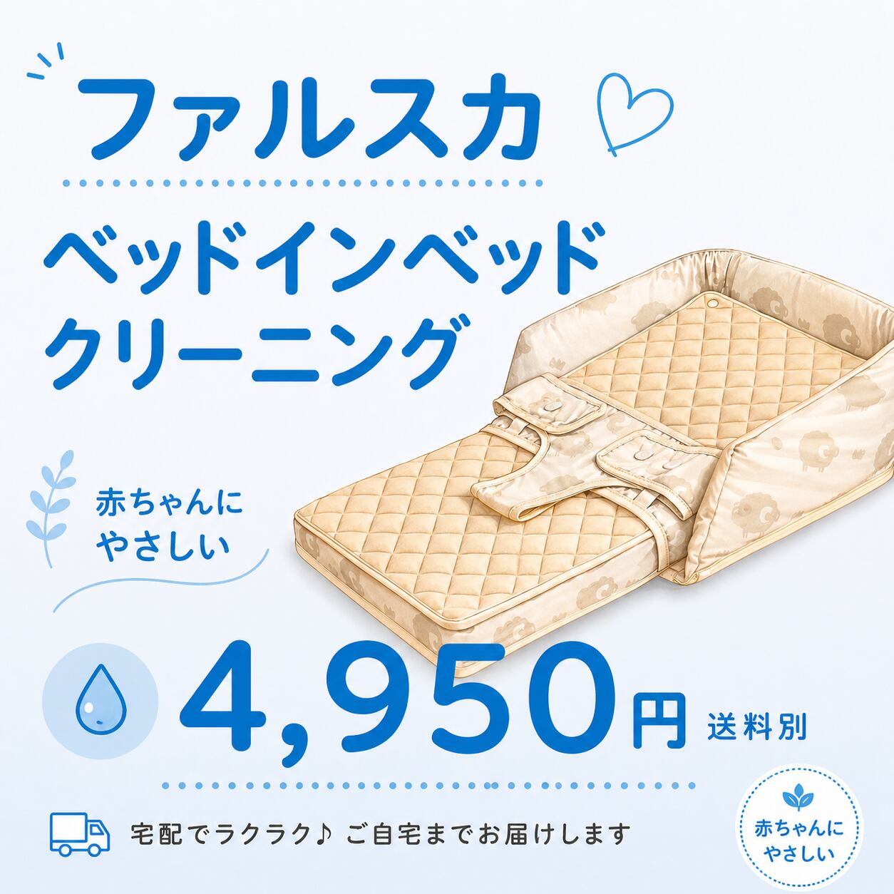 人気のファルスカシリーズベッドインベッドのクリーニングです。なかなかご自分でのお手入れは大変ですよね。見た目はきれいでも、赤ちゃんの汗やよだれ、ミルク汚れが内側やクッション部分に蓄積しています。
